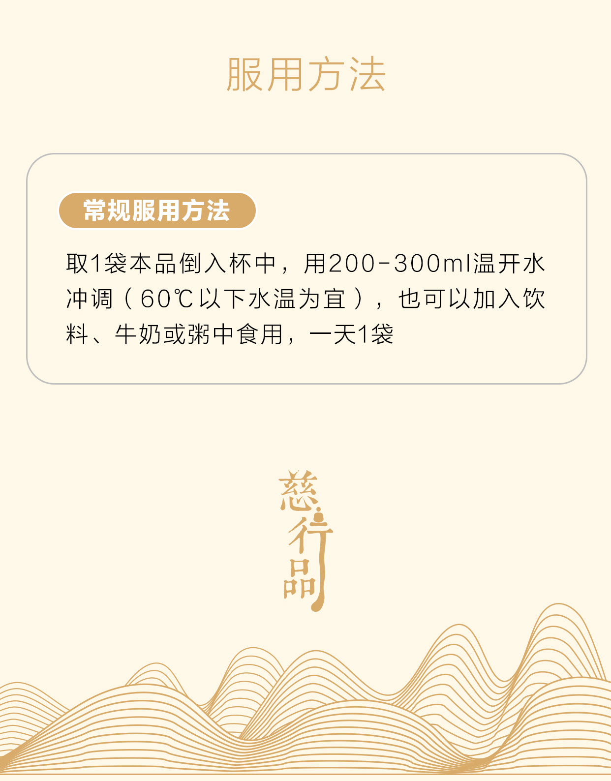 食用方法:取1袋本品倒入杯中,用200-300ml温开水冲调(60℃以下水温为宜),也可以加入饮料、牛奶或粥中食用,一天1袋