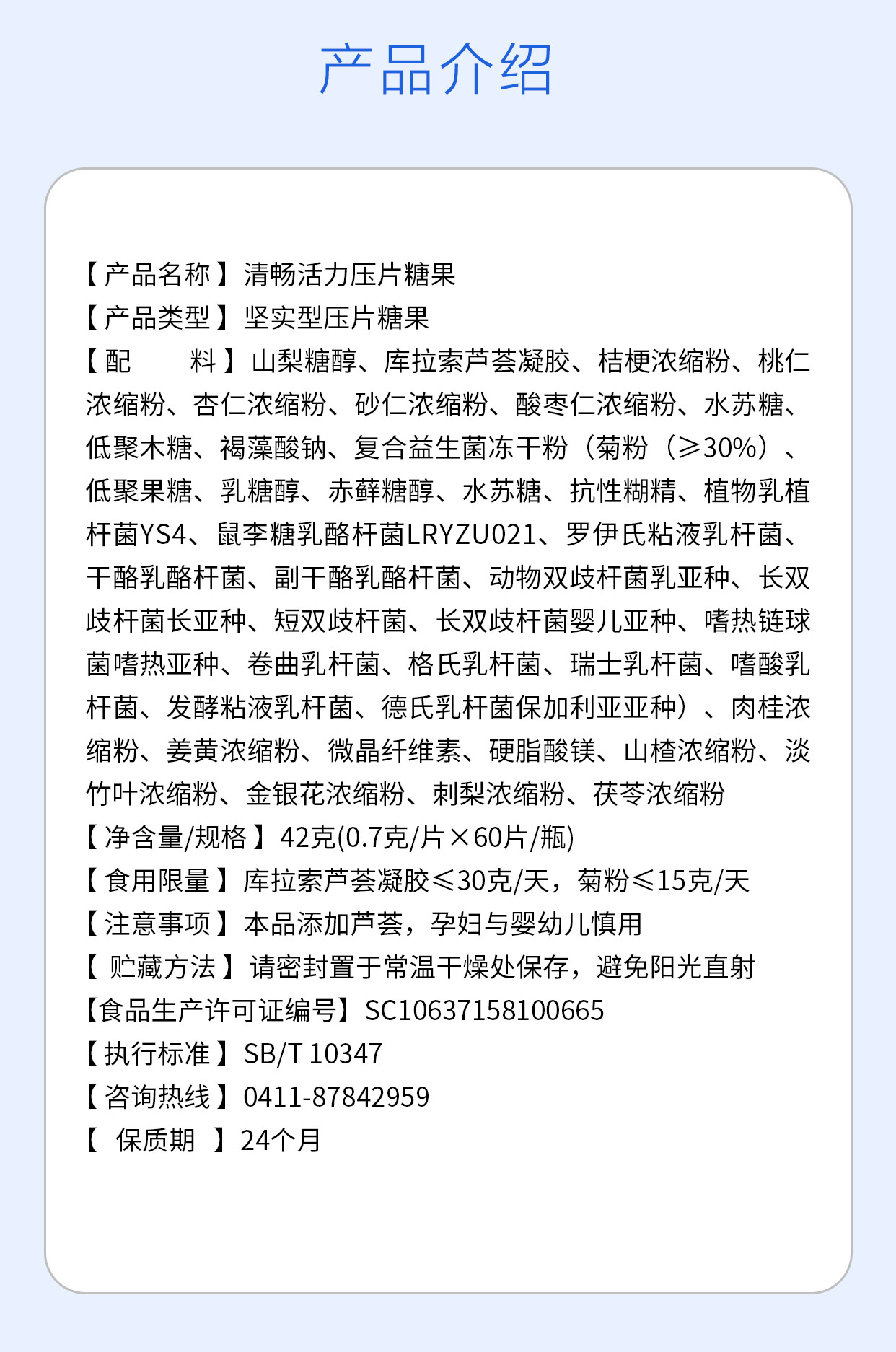 配料:山梨糖醇、库拉索芦荟凝胶、桔梗浓缩粉、桃仁浓缩粉、杏仁浓缩粉、砂仁浓缩粉、酸枣仁浓缩粉、水苏糖、低聚木糖、褐藻酸钠、复合益生菌冻干粉(菊粉(≥30%)、低聚果糖、乳糖醇、赤藓糖醇、水苏糖、抗性糊精、植物乳植杆菌YS4、鼠李糖乳酪杆菌LRYZU021、罗伊氏粘液乳杆菌、干酪乳酪杆菌、副干酪乳酪杆菌、动物双歧杆菌乳亚种、长双歧杆菌长亚种、短双歧杆菌、长双歧杆菌婴儿亚种、嗜热链球菌嗜热亚种、卷曲乳杆菌、格氏乳杆菌、瑞士乳杆菌、嗜酸乳杆菌、发酵粘液乳杆菌、德氏乳杆菌保加利亚亚种)、肉桂浓缩粉、姜黄浓缩粉、微晶纤维素、硬脂酸镁、山楂浓缩粉、淡竹叶浓缩粉、金银花浓缩粉、刺梨浓缩粉、茯苓浓缩粉