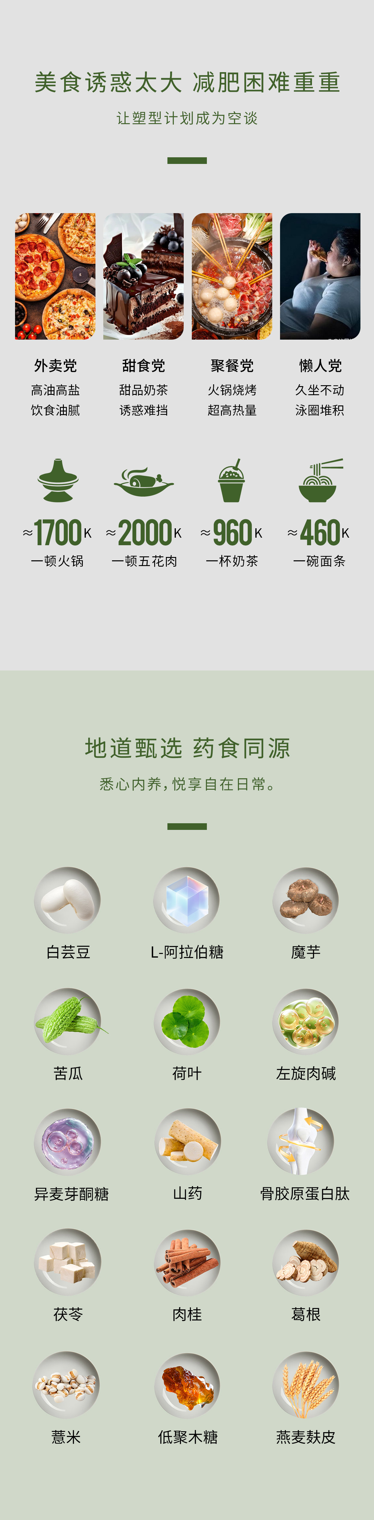 配料:燕麦麸皮粉、异麦芽酮糖、荷叶粉、魔芋粉、山药粉、低聚异麦芽糖、L-阿拉伯糖、骨胶原蛋白肽、茯苓粉、薏米粉、生姜粉、肉桂粉、葛根粉、左旋肉碱、甜橙果粉、低聚木糖、红豆粉、黑豆粉、黄瓜籽粉、蒲公英粉、白芸豆提取物、巧克力香精、维生素C、三氯蔗糖、盐酸硫胺素(维生素B1)、 核黄素(维生素B2)