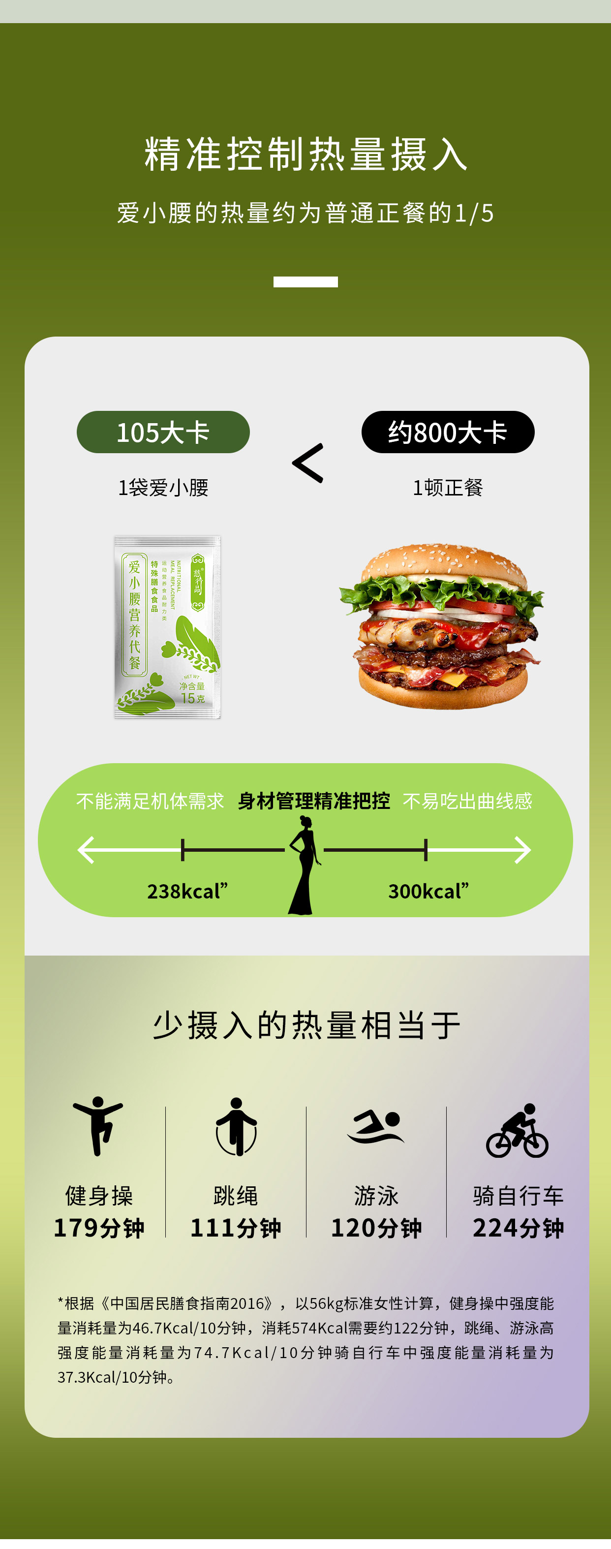 ③爱小腰的热量约为普通正餐的1/5,精准控制热量摄入,从源头阻断淀粉摄入,抑制脂肪吸收,糖异生消耗脂肪,三个维度促进脂肪分解